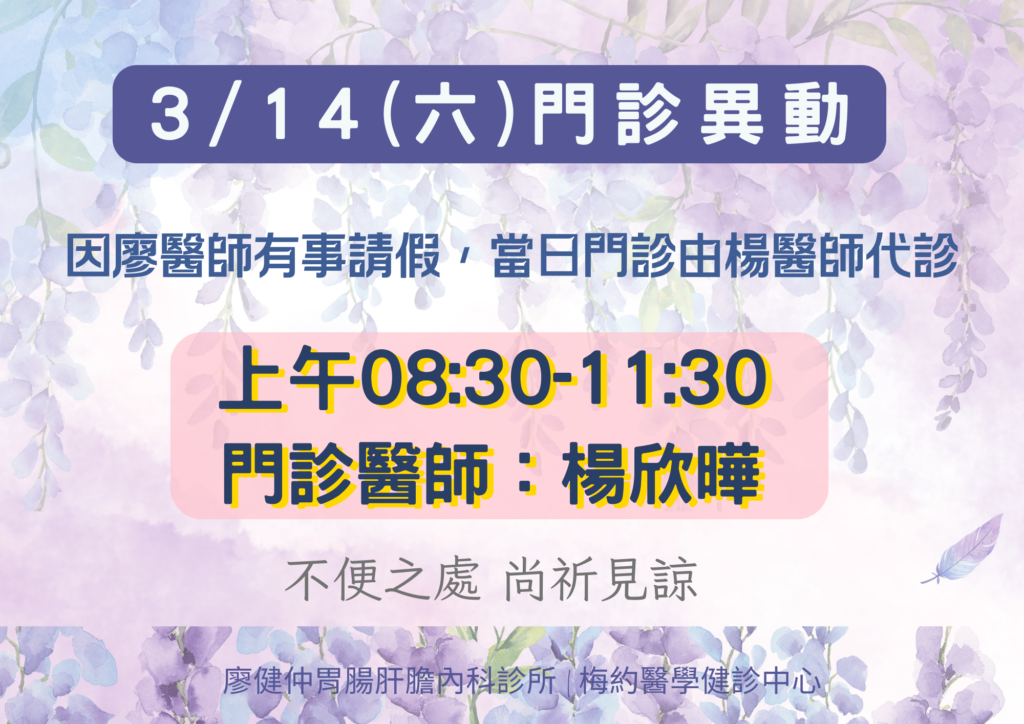 【代診公告】2026/3/14(六)楊醫師代診